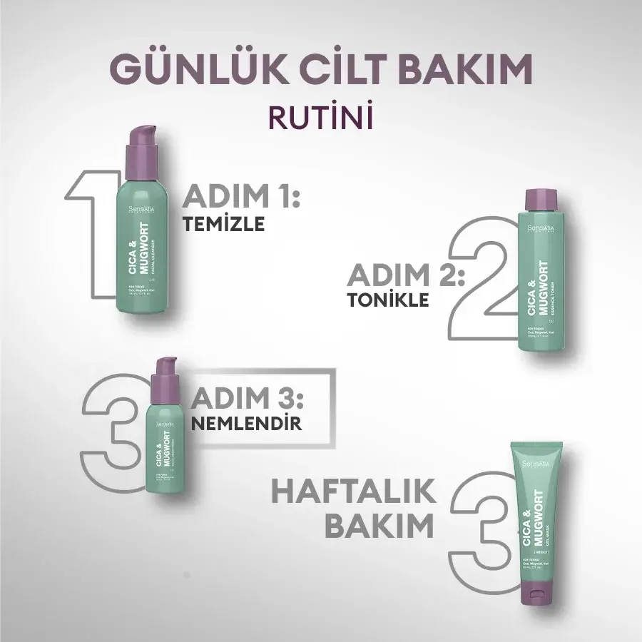 Cica & Mugwort Yüz Nemlendiricisi, cilde derinlemesine nem sağlayarak tahrişi yatıştırır ve sebum üretimini dengelemeye yardımcı olur. Cica özü, cilt yenilenmesini destekler ve tahrişi sakinleştirir; Misk otu, antibakteriyel özellikleriyle akneyle mücadele eder; kivi özü ise yağ üretimini kontrol ederek sivilce riskini azaltır. Düzenli kullanımda cilt daha sağlıklı, esnek ve parlak bir görünüme kavuşur.